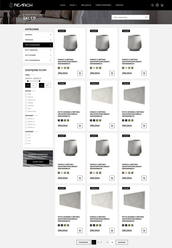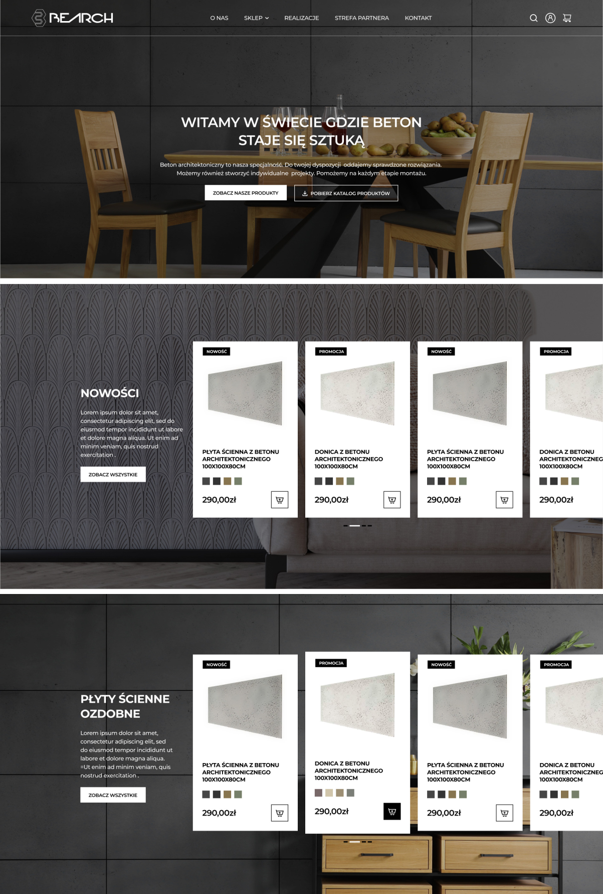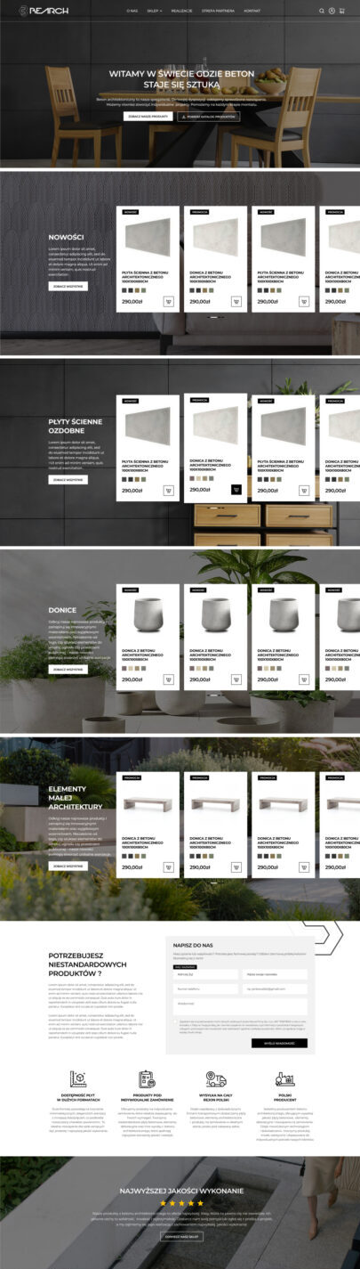 Projekt dla BeArch.pl to przykład umiejętnego połączenia estetycznego designu z rozbudowaną funkcjonalnością e-commerce. Dzięki przemyślanej strukturze, czytelnej prezentacji oferty i wygodnemu procesowi zakupu, strona skutecznie wspiera sprzedaż, jednocześnie wzmacniając pozycję marki jako lidera w segmencie betonu architektonicznego.