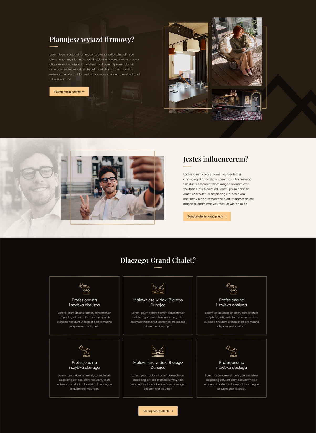 Już od pierwszego spojrzenia uwagę przyciąga pełnoekranowe, wysokiej jakości wideo w sekcji głównej. Ten dynamiczny element natychmiast zanurza użytkownika w malowniczym krajobrazie Tatr i oddaje wyjątkowy klimat Grand Chalet. Wideo płynnie łączy się z formularzem rezerwacji, dzięki czemu odwiedzający mogą sprawdzić dostępność i zarezerwować pobyt bezpośrednio z poziomu strony głównej.